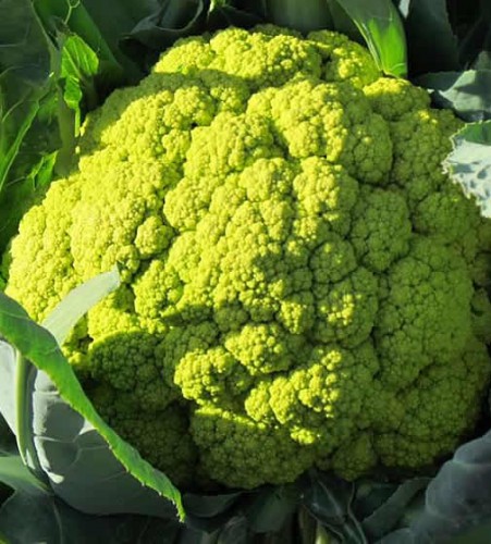 Green Cauliflower vegetable is uniformly shaped, heads are thick and solid with tight curds. Good for both early and late season crops. This variety is somewhat self-blanching variety, the large outer leaves tend to curl around the green head protecting it from the elements.